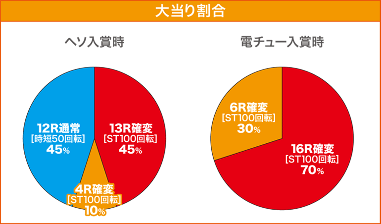 | 確変突入率 | ヘソ入賞時:55% 電チュー入賞時:100% (ST100回転) |