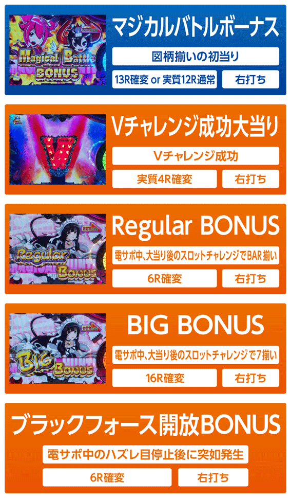 図柄揃いの初当りはマジカルバトルボーナスで、ラウンドバトルの結果によりSTor時短突入が決定。バトルに勝利すれば13R大当り+ST突入で、敗北した場合は実質12R大当り+時短突入となる。なお、ラウンドバトルの勝率は50%となっている。