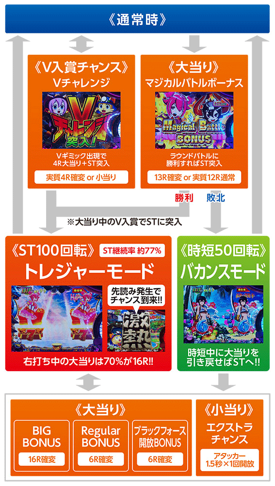 本機のSTモードで、マジカルバトルボーナスのラウンドバトル勝利後やVチャレンジからの大当り後に突入。ST継続率は約77%。