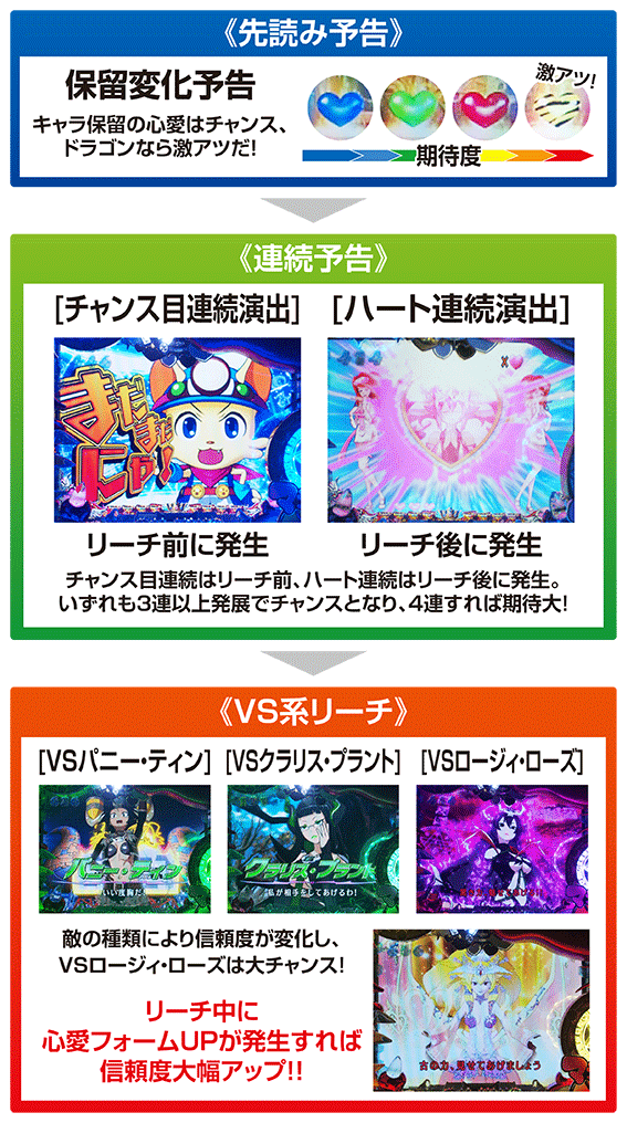 チャンス目連続演出はリーチ前、ハート連続演出はリーチ後に発生。いずれも最高の4連継続で大チャンスとなる。また、チャンスメダルギミックが落下すれば期待度大幅アップだ!