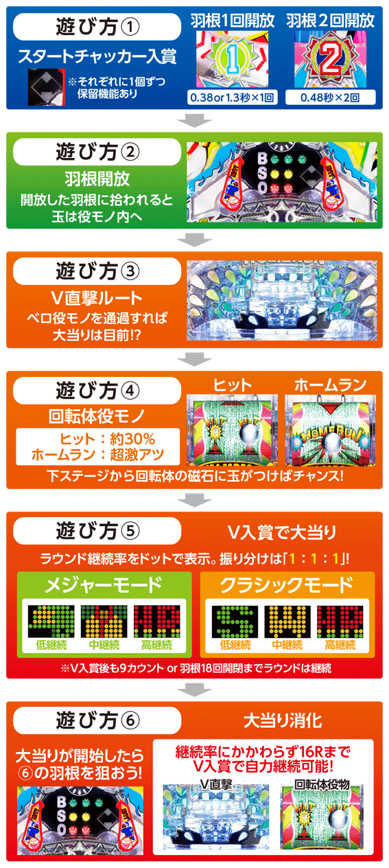 メジャーモードでは「ユニホーム」、クラシックモードでは「W」がドットに表示されると中継続開放。回転体の磁石に効率よく玉がつくかどうかが自力継続の鍵を握っている。
