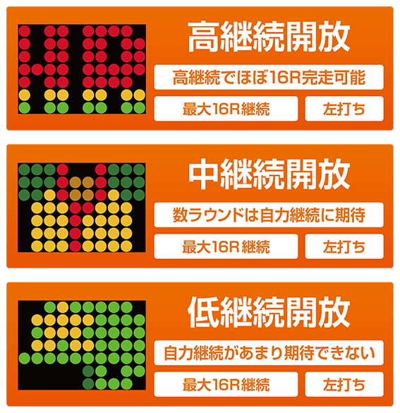 ★大当りはすべて最大15Rまで自力継続可能だが、ドット図柄によって継続率が変化する。