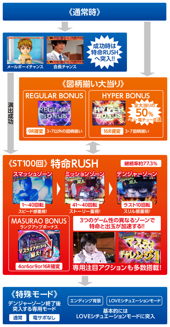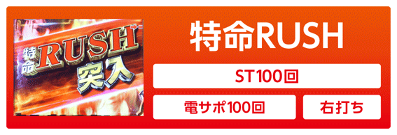 本機には潜確がなく、大当り後(突然確変を含む)は必ずSTの特命RUSHに突入。特命RUSHは100回転のSTで、電サポも100回転まで。特命RUSHは回転数によって、スマッシュゾーン(1〜40回転)→ミッションゾーン(41〜90回転)→デンジャーゾーン(91〜100回転)と、メイン演出が異なるゾーンで展開。ST継続率は約77.3%となっている。