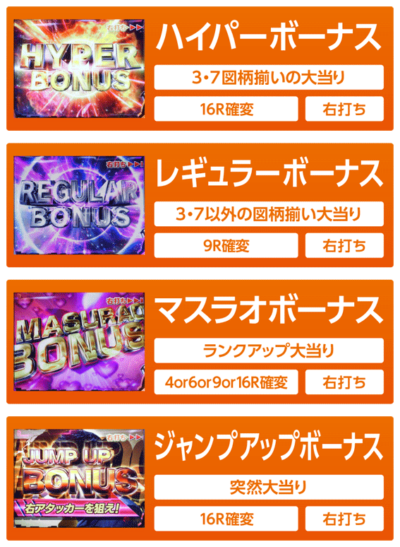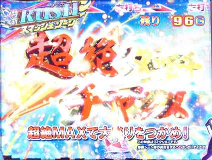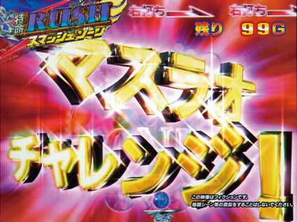 特命RUSH中(電チュー入賞)のみ、マスラオチャレンジ成功で発生する可能性があるランクアップボーナス。マスラオアタッカー(上アタッカー)が開放し、4Rで約290個、6Rで約430個、9Rで約650個、16Rで約1200個の出玉となる。