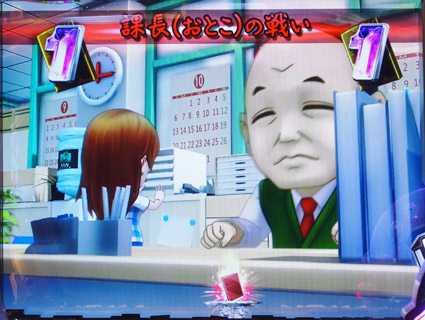 実写ロングリーチは写真の「只野のフン闘」「坪内の怒り」「新水の誘惑」に「課長の悩み」を加えた全4種類。リーチ中に発生するスクラッチチャンスなどから、会長チャンスに発展する可能性あり!