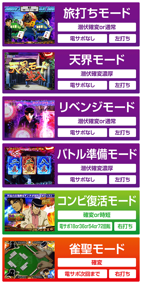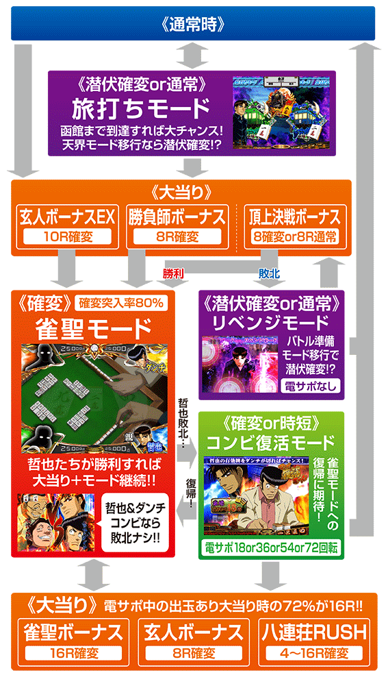 継続率80%の確変モード。滞在中は哲也と敵の玄人たちの麻雀バトルが発生。哲也がバトルに勝利すれば大当り+モード継続、敗北した場合はコンビ復活モード突入となる。なお、バトルにはソロルート・コンビルート・特殊ルートの3つのルートが存在し、ソロルート以外はバトル敗北の心配ナシ!
