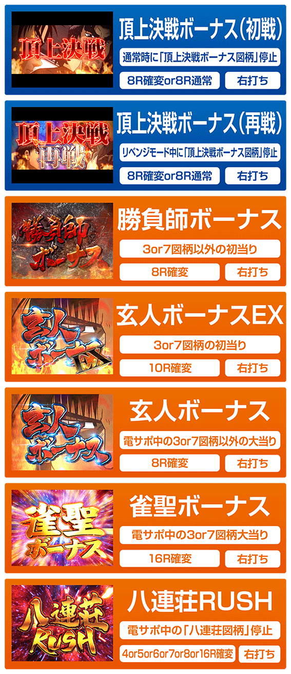 「頂上決戦ボーナス」図柄停止で発生する大当り(8R確変or通常・下アタッカー消化)。ラウンド中は哲也VSドサ健の対決が発生し、哲也が和了牌をツモれば哲也勝利で雀聖モードへ突入、哲也がドサ健の和了牌を掴んでしまったら哲也敗北でリベンジモードへ突入する。