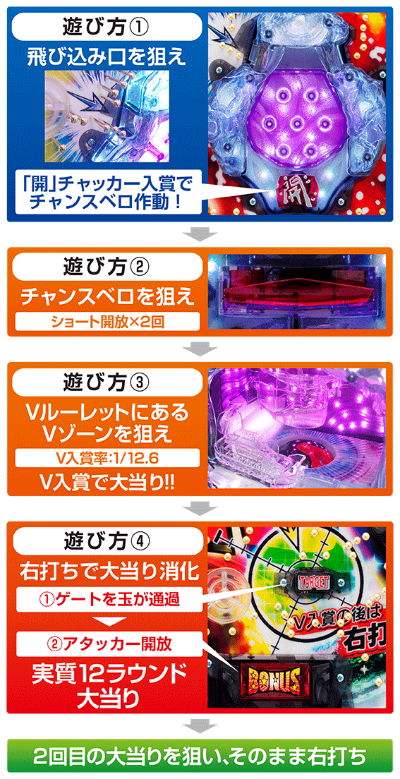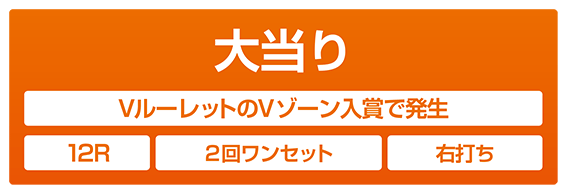 盤面下部の役モノ内のVルーレットにあるVゾーンに玉が入賞すると大当り。右打ちで右肩にあるゲートに玉を通過させると、その下にあるアタッカーが開放。12ラウンドで約1440個の払い出し。本機は2回ワンセットで大当りを獲得できるゲーム性となっているので、初回大当りで約2880個の払い出しが期待できる。