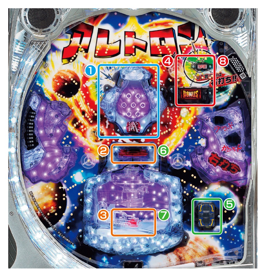 名機『メガトロン』を彷彿させる7本のピンが、玉の流れを左右する。