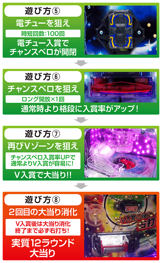 初回V入賞を果たし右打ちで大当りラウンドを消化すると、100回転の時短に突入するのでそのまま右打ちでプレイを継続。盤面右下の電チューでチャンスベロがロング開放するため、2回目のV入賞は容易に獲得可能。大当りラウンド消化後は通常に移行する。
