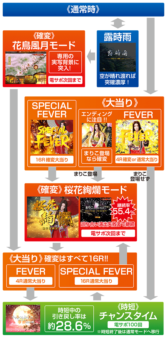 初回大当りの「FEVER」でまりこが登場しなかったときと、確変モード中のすべての「FEVER」後に突入する100回転の時短モード。時短引き戻し率は約28.6%となっている。