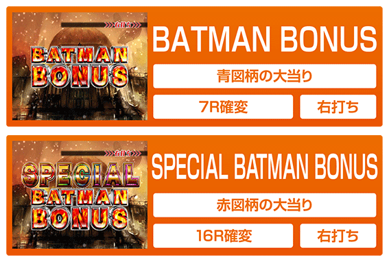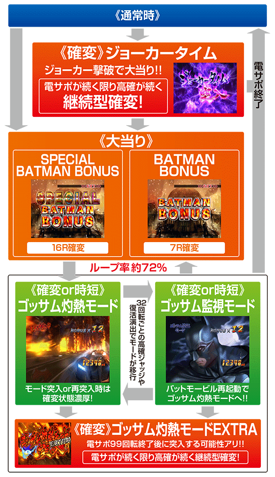 図柄揃い大当り後は「ゴッサム灼熱モード」に突入。モード中は32回転ごとに継続演出が発生し、成功すればモード継続、失敗した場合は「ゴッサム監視モード」へ移行する。「ゴッサム監視モード」移行後も確変の可能性はあり、バットモービルが再発進する復帰演出に成功すれば「ゴッサム灼熱モード」へ復帰。また、電サポ99回転終了時に「ゴッサム灼熱モードEXTRA」に突入すれば確変濃厚で、確変が続く限り(継続抽選にもれない限り)電サポも継続する。