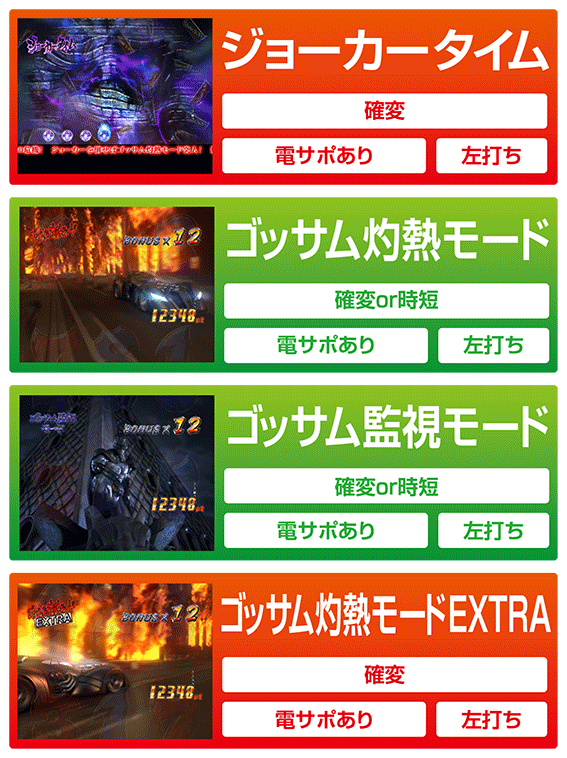 ダイナマイト保留が出現するとモード終了のピンチで、爆発してしまうとモード終了となる。なお、モード終了画面でバットマンが出現すれば「ゴッサム灼熱モード」へ突入!