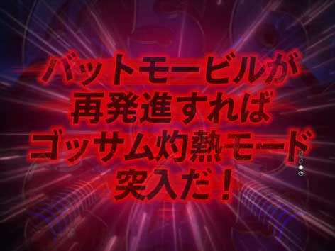 「ゴッサム灼熱モード」32回転経過後に発生するモード継続演出。ジョグを回転させてメーターがMAXになればモード継続、失敗すると「ゴッサム監視モード」へ移行。突入時に出現するザコが、1人<2人<3人と多いほどモード継続に期待できる。