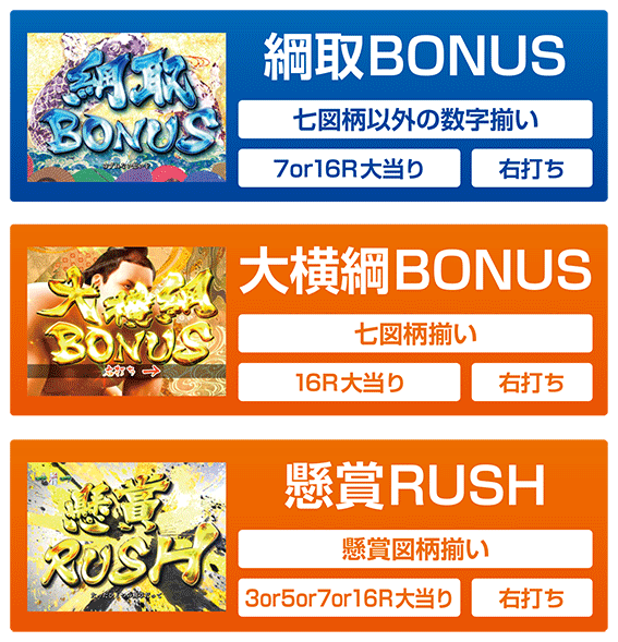 七図柄以外の数字揃いで発生する大当り。アタックラウンド獲得演出に成功すると16Rの大横綱BONUSに昇格し、失敗すると7R大当り+時短突入となる。アタックラウンドはV入賞で確変突入。