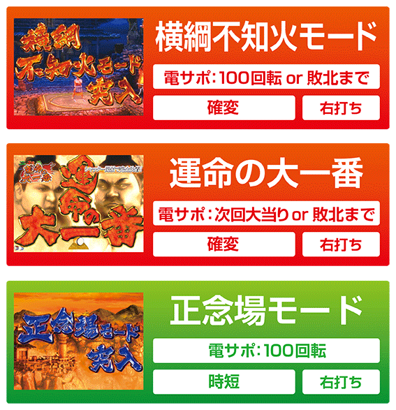 横綱不知火モード100回転消化し、なお確変状態の場合に移行する確変モード。バトル勝利で大当り+横綱不知火モード突入。バトル敗北時は通常モードに移行する。