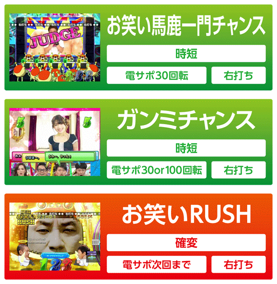 弱系スーパーなどから突入する30回転の時短モード(出玉なし通常当選)。滞在中は芸人たちがネタを披露し、審査員のジャッジが満点なら大当りとなる。