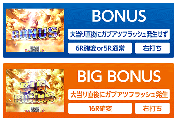 大当り直後にガブアツフラッシュが発生しなかった場合は「BONUS」。ラウンド中に発生する「お笑いRUSH CHALLENGE」に成功すればお笑いRUSHへ突入、失敗した場合はガンミチャンス突入となる。