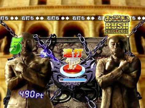 BONUS中に発生し、チャレンジ成功でお笑いRUSH突入、失敗した場合はガンミチャンス突入となる。初当り時はダウンタウンを解放するチャレンジが発生。ボタン押しのパターンは一発<長押し<連打の順でチャレンジ成功期待度がアップする。また、RUSH中はチャレンジの種類が変化。様々なチャレンジが用意されており「VSドクロ」が選ばれれば大チャンスとなる。RUSH中のチャレンジは途中で発生するカットインの種類も重要だ!