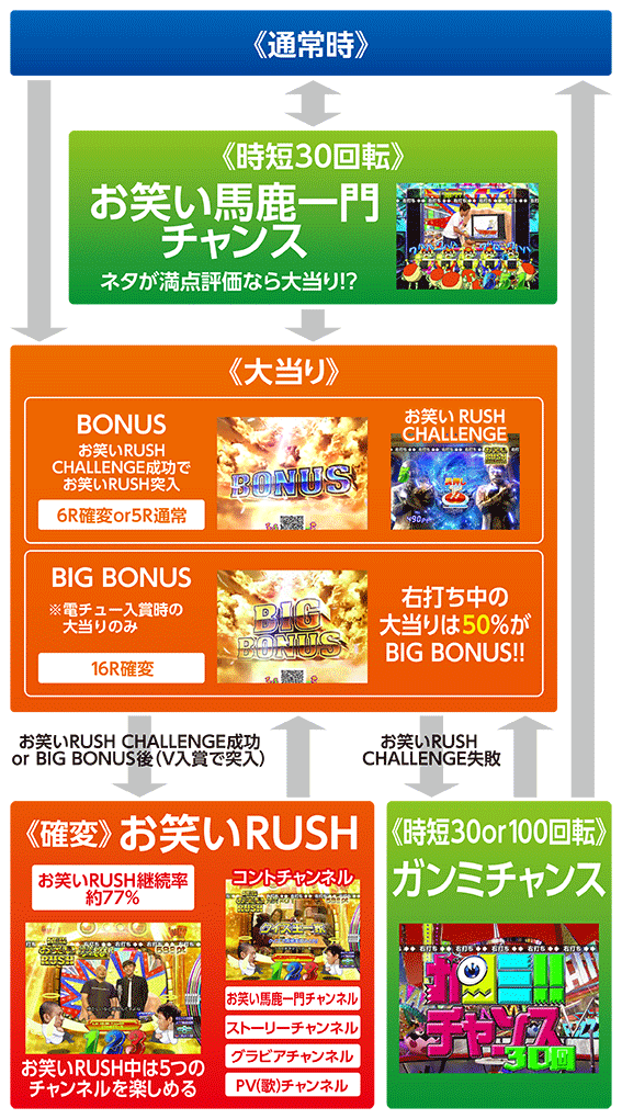 BONUS中の「お笑いRUSH CHALLENGE」成功後やBIG BONUS後に突入する、継続率約77%の確変モード。大当りは即当りがメインとなっており、滞在中はコントやPVなど5つのチャンネルを楽しむことができる!