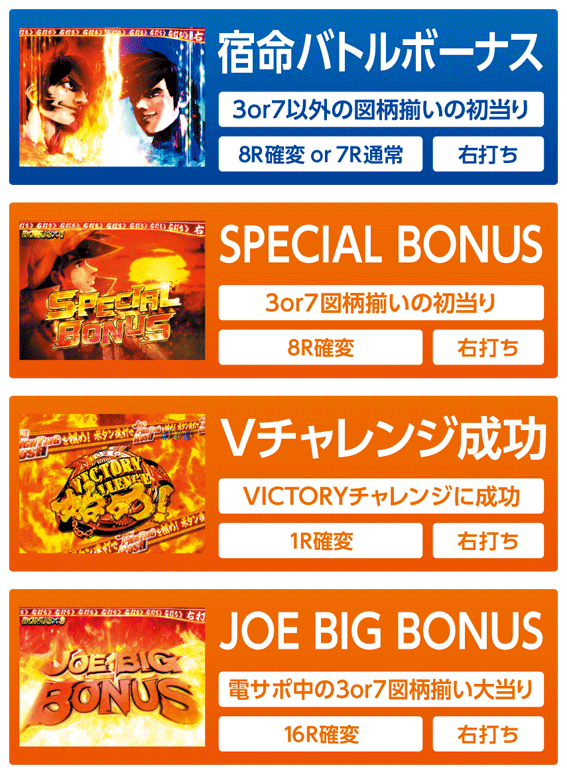 3or7以外の図柄揃いの初当りは「宿命バトルボーナス」で、ラウンド中はジョーが力石の幻影と激突。見事ジョーが勝利すればST「ジョーファイティングラッシュ」突入で、ジョーが敗北した場合は時短「リベンジモード」へ突入する。