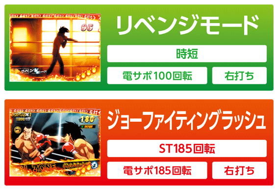 ★185回転のロングST「ジョーファイティングラッシュ」中は、ジョーとライバルたちとのバトルが発生。ST回転数により対戦相手が変わり、バトル発生頻度や勝利期待度も変化。