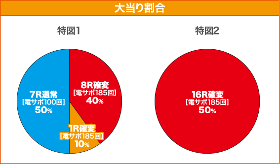 | 確変突入率 | ヘソ入賞時:50% 電チュー入賞時:100% (ST185回転) |