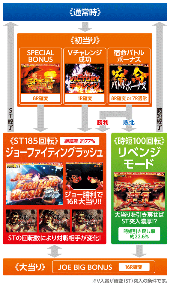 ノーマルリーチやロングリーチ後に発生する「VICTORYチャレンジ」に成功すれば実質1R大当りで、ラウンド後はST「ジョーファイティングラッシュ」へ突入。