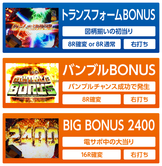 両リーチとも敵の攻撃を回避すれば、信頼度アップのSPSPへ発展。攻撃回避に失敗しても図柄変形による「バンブルチャンス」や「オプティマスプライムSPSPリーチ」発展の可能性あり!