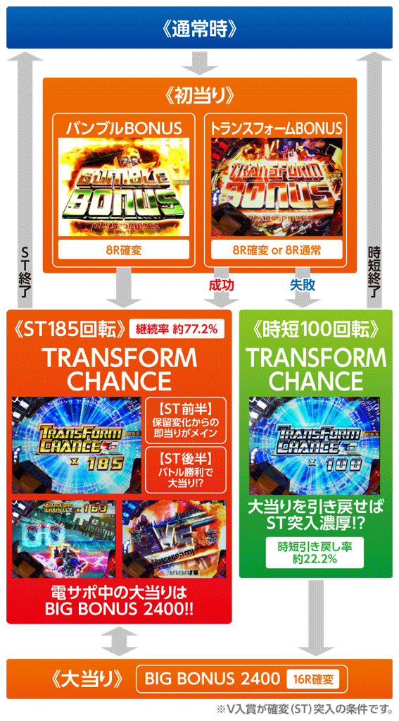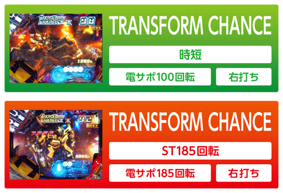トランスフォームBONUS中のプライムミッション成功時や、バンブルBONUS後に突入するST185回転。STは回転数により前半戦と後半戦に分かれており、前半戦は保留変化からの即当り、後半戦はバトルリーチがメインで発生する。ST継続率は約77.2%。