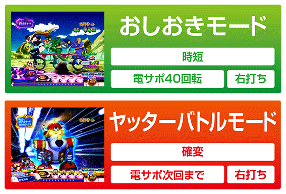 継続率80%を誇る本機の確変モード。「エンペラーバトルボーナス」勝利時や「ドクロジャッジボーナス」成功時、「Vボーナス」後に突入する。滞在中はヤッターメカVSドロンボーメカのメカ戦が発生。ヤッターメカが勝利すれば大当り+モード継続、敗北した場合は時短「おしおきモード」へ突入する。