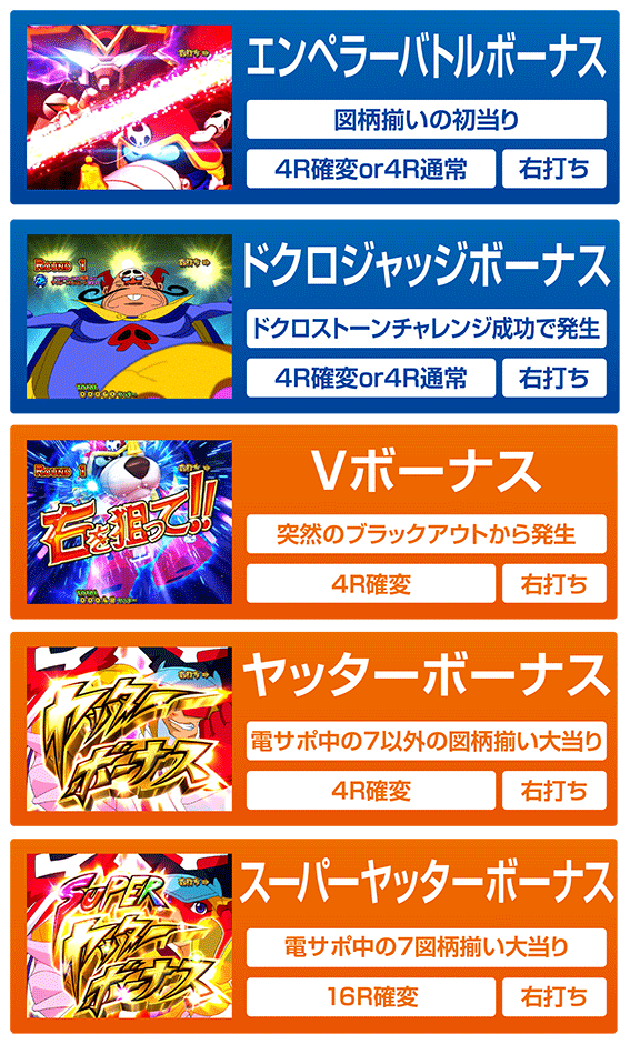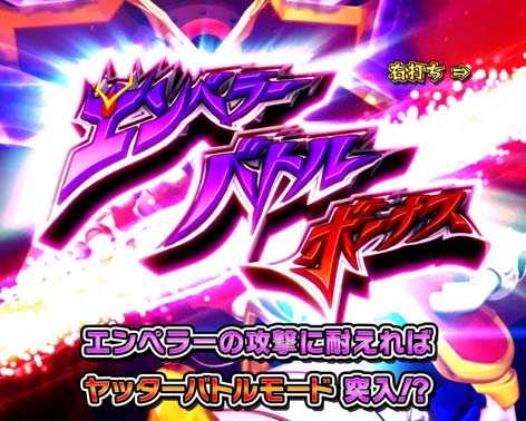 図柄揃いの初当りは「エンペラーバトルボーナス」。ラウンド中はヤッターワンVSドクロエンペラーのバトルが発生し、ヤッターワンが勝利すれば確変「ヤッターバトルモード」へ突入、敗北した場合は時短「おしおきモード」へ突入する。