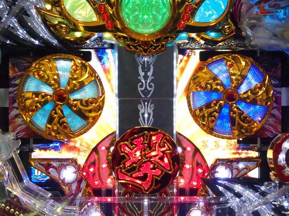 | 溜まった左下の数字をリーチ中のPUSHボタンで解放。その際に変化した宝石の色が期待度を示唆。 青<緑<赤<レインボー で期待度アップ。 |