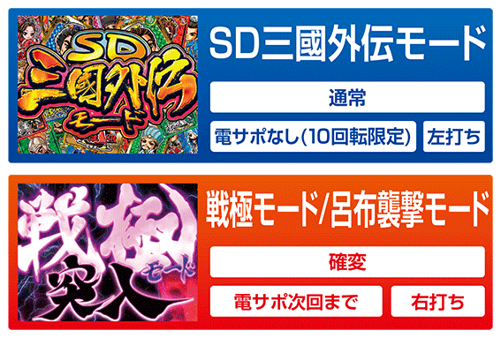 極三國ボーナス後、赤壁ボーナスでの勝利or復活後、戦極図柄停止時(突確)は、77%で継続する確変「戦極モード」に突入。80回転までは合戦演出などの専用演出が展開される。81回転目からは「呂布襲撃モード」に移行し、その名のとおり呂布の襲撃を受ける展開に。突確時に呂布図柄が停止した場合のみ呂布襲撃モードからのスタートとなる。いずれも演出成功or勝利した場合は16R確変でモード継続、敗北した場合は4R通常でラウンド後は通常ステージに移行する。
