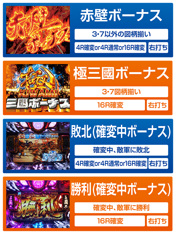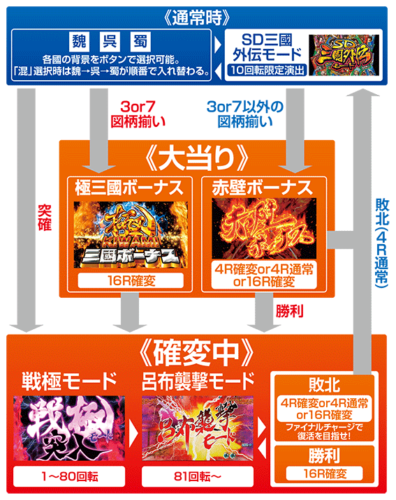 通常時の3・7以外の図柄揃いは4Ror16R大当りの「赤壁ボーナス」。ラウンド中に発生する敵軍との戦いに勝利すれば16R確変大当りで、ラウンド終了後は確変「戦極モード」に突入。破れた場合は4R通常大当りで、ラウンド終了後は通常ステージに移行する。破れた場合でも復活演出経由で「戦極モード」に移行する場合あり。