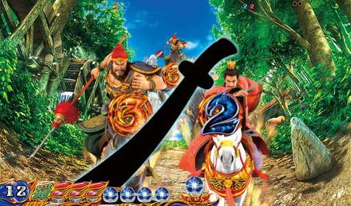 通常、左打ち時の37.5%をしめる出玉なし大当り(突確)へのメインルートがこの「群雄伝チャンス」。突入パターンは群雄伝ゾーンを経由したり、ボタンPUSHで中図柄停止、リーチハズレからの発展などなど。多彩に突入ルートが用意されている事で、ちょっと残念な演出でも最後までドキドキできるぞ!