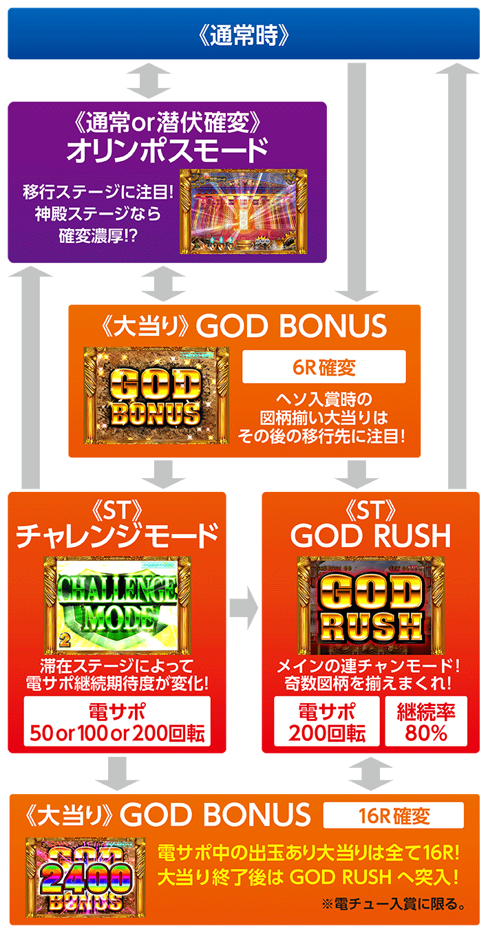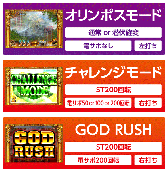 図柄揃い大当り後に突入する可能性のあるモードで電サポは最大で200回転。50回・100回到達時のメデューサジャッジ成功で電サポが継続。失敗時はオリンポスモードへ。3種類のステージで電サポ継続期待度を示唆している。