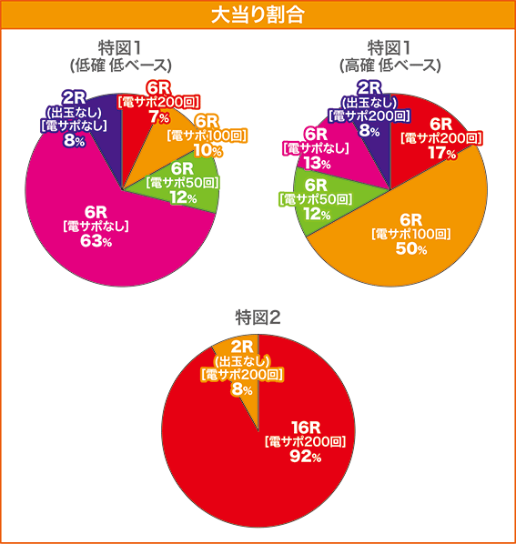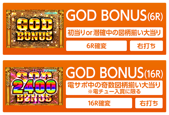 電サポ中の出玉あり大当り(電チュー入賞に限る)は奇数図柄揃いで突入する16R大当り。大当り終了後はGOD RUSHに突入。
