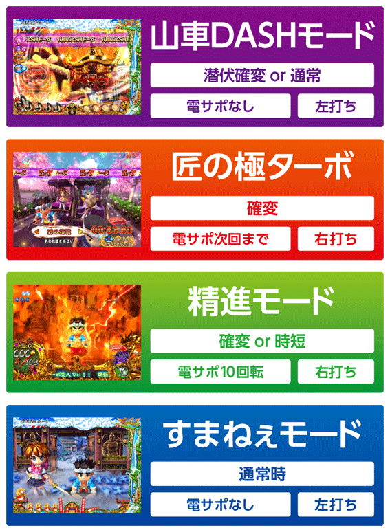 潜伏確変の可能性があるモードで、気合ボーナス失敗後や山車出しチャンス成功で突入。滞在中は背景で潜伏確変の期待度が変化し、嵐背景になれば潜伏確変濃厚となる。