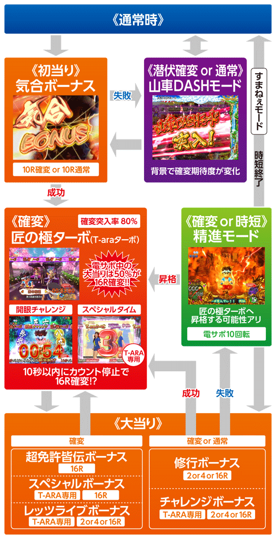 T-araターボ中に発生する大当り。ラウンド中に発生するミッションに成功すれば匠の極ターボへ突入し、失敗した場合は精進モード突入となる。マル源ギミックが落下すれば16R確変の「スペシャルボーナス」へ昇格!!