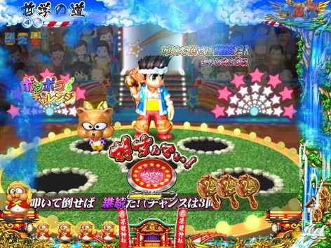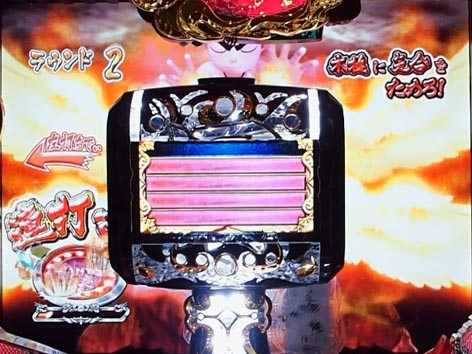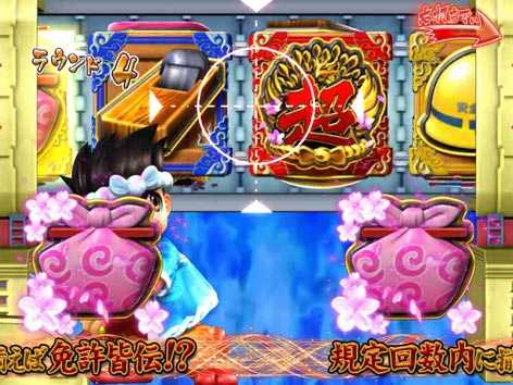 ボタン押しで木槌ギミックがハズレ図柄を弾き飛ばす。木槌ギミックに登場するキャラが重要!?