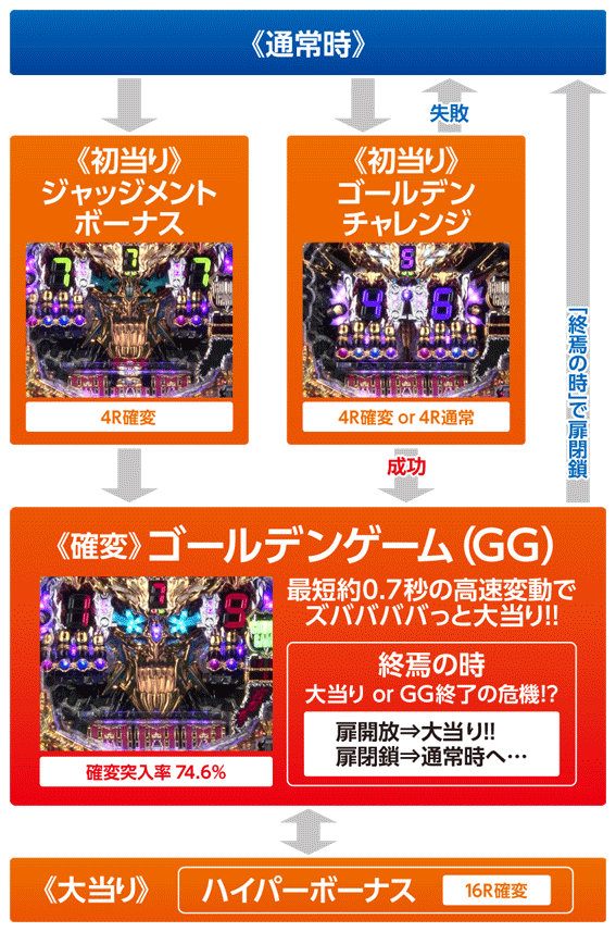 本機の確変モードで、ジャッジメントボーナス後やゴールデンチャレンジ成功後に突入。滞在中の大当りは、高速変動からの即当りがメインとなっている。「終焉の時」発生はGG終了のピンチで、扉が開けば大当り+GG継続、扉が閉じるとGG終了で通常モードへ移行する(出玉なし通常当選)。