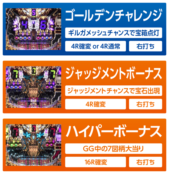 ギルガメッシュチャンスから当選する大当り。ラウンド中にボタンをPUSHして、宝箱の中から宝石が出現すればGGへ突入、空だった場合は通常時へ移行する。