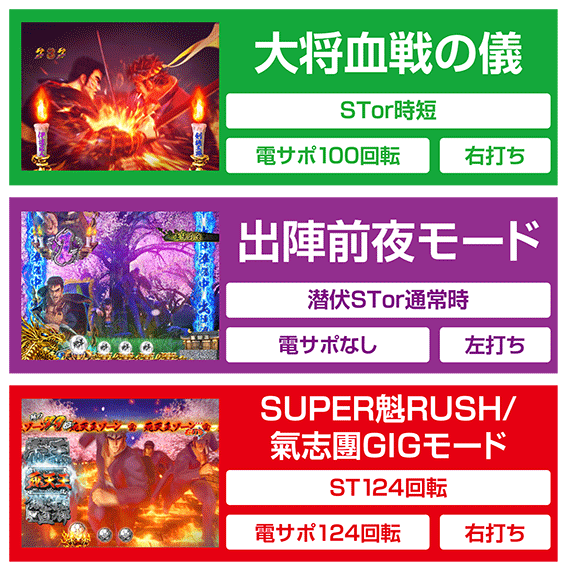 大将血戦ボーナス後に突入する電サポ100回転のモード。滞在中は桃太郎と伊達のバトルが繰り広げられ、桃太郎が勝利すれば大当り+SUPER魁RUSH(氣志團GIGモード)突入。100回転終了後は出陣前夜モードへ移行する。