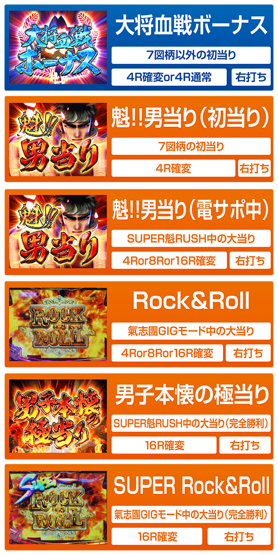 電サポ中は大当り直後に一刀両断役モノが発動すると、「完全勝利」で16R確変となる。ラウンド終了後はSUPER魁RUSH(氣志團GIGモード)へ突入。