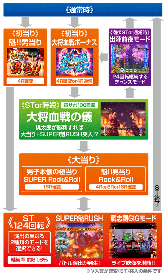 初当りの「魁!!男当り」後や「大将血戦の儀」中の大当り後に突入する電サポ124回転のSTモード。「SUPER魁RUSH」と「氣志團GIGモード」、2つのモードを選択可能だ(16R大当り後)。