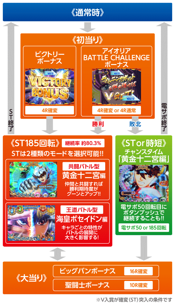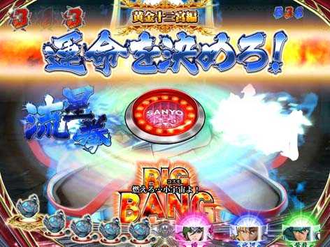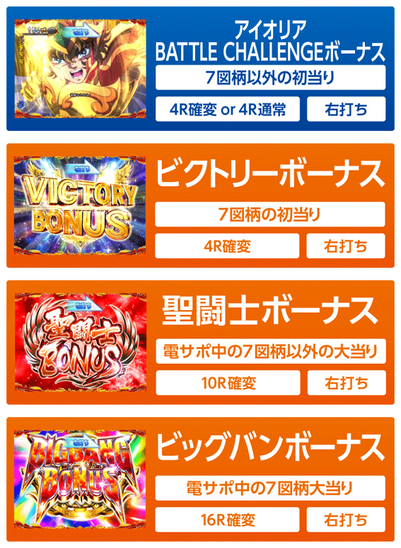 電サポ中の大当りは図柄でラウンド数が変わり、7図柄なら16Rの「ビッグバンボーナス」、7図柄以外なら10Rの「聖闘士ボーナス」となる。いずれもラウンド後はSTへ突入。