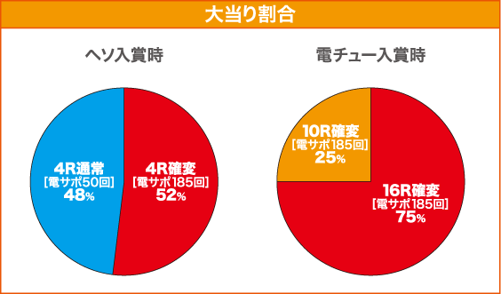 | 確変突入率 | ヘソ入賞時:52% 電チュー入賞時:100% (ST185回転) |