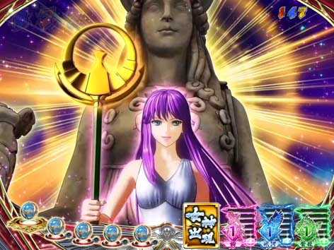沙織が主役のリーチで、「帰還を待つ沙織リーチ」はアニメ映像、「アテナの小宇宙リーチ」は3D映像で展開する。両リーチとも、セリフやカットインなどのチャンスアップ発生に期待したい。
