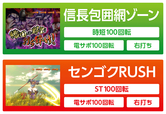 センゴクRUSH直当り以外の初当り後に突入する100回転の時短。この間に再度大当りを引いてST「センゴクRUSH」を目指そう。時短中に大当りを引ける確率は約39.4%となっている。